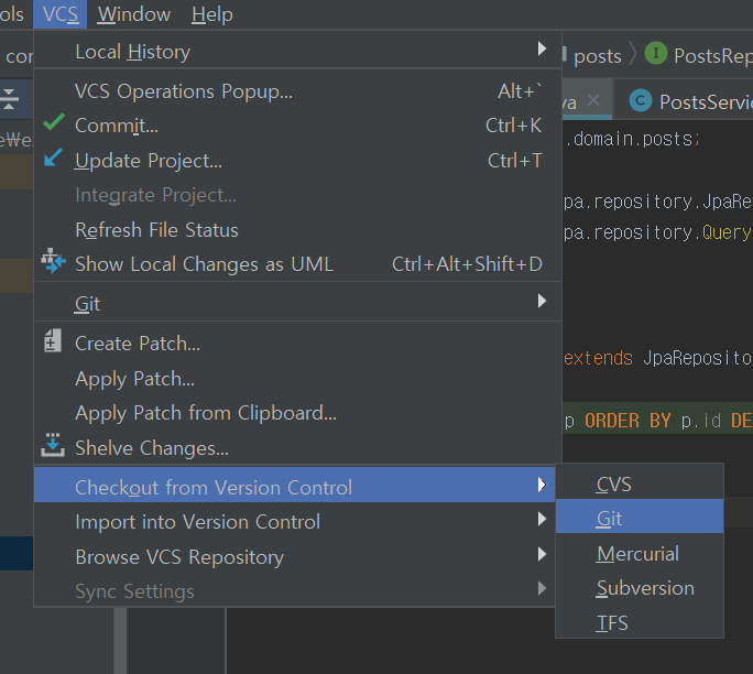 1. ๋ฉ๋ด > VCS > Checkout from Version Control > Git ์ ํ